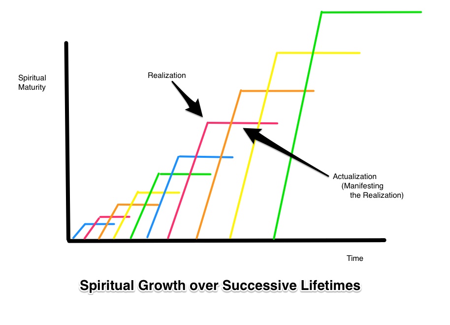 The capacity to achieve actual spiritual illumination comes later, approximately mid-way through the whole cycle of evolutionary challenges (approximately where the arrow points to “Realization”).